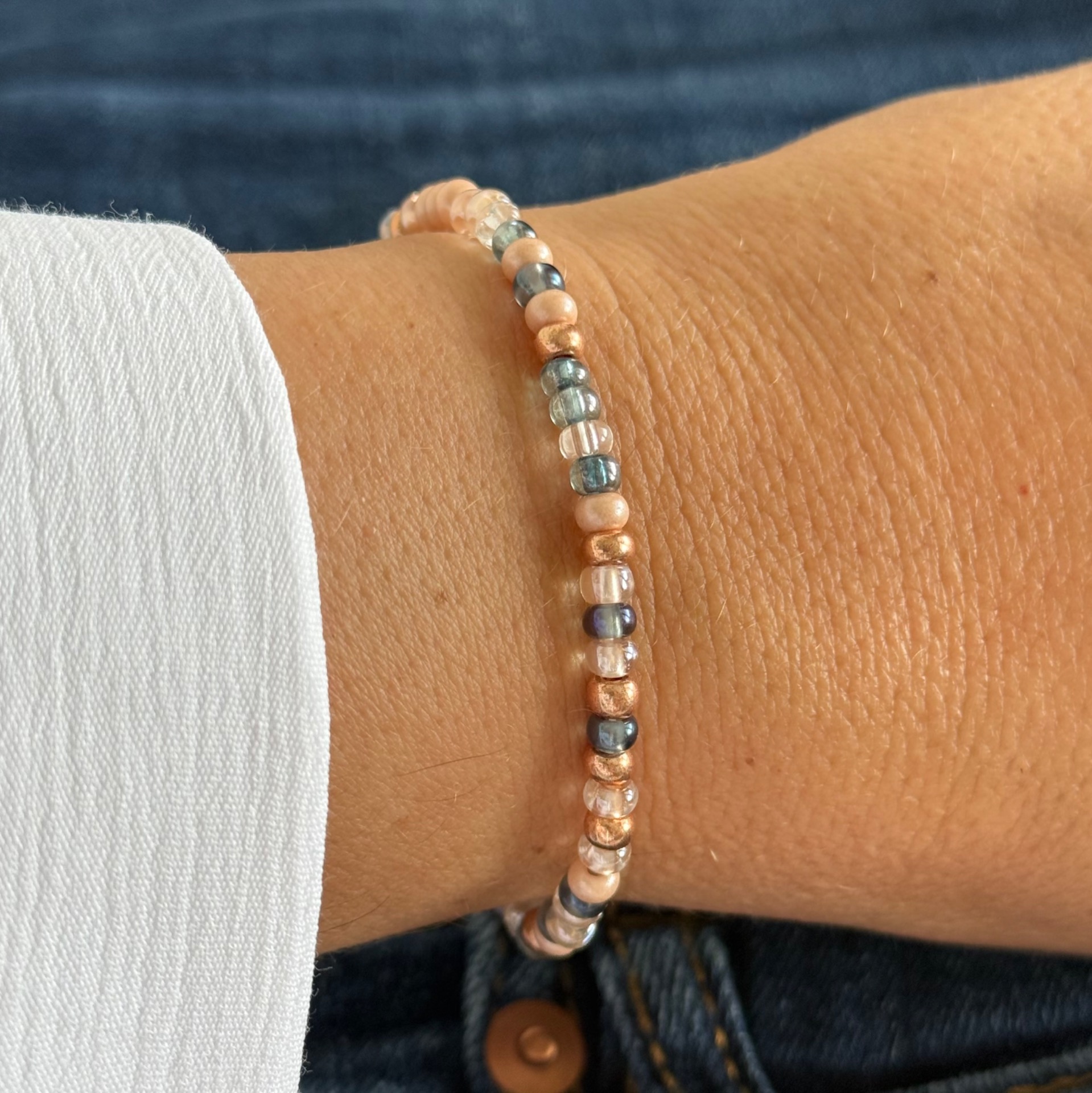 Barva lososová, rose gold, šedá průzračná, šedá duhová, průzračná s lososovým průtahem: česká Preciosa.