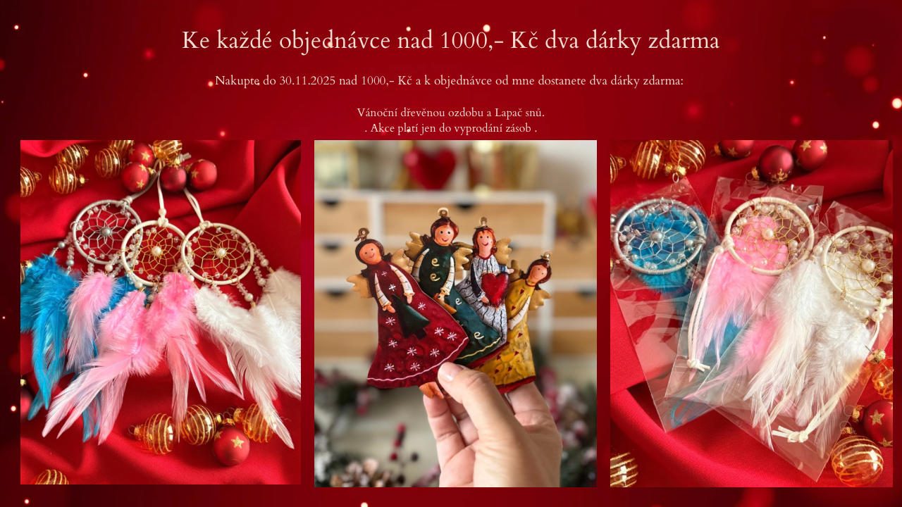 Dva vánoční dárky ke každé objednávce nad 1 000,- Kč. Nakup do 30.11.2025 a já ti přibalím dvě překvapení: vánoční dřevěnou Andělskou ozdobičku a Lapač snů, plný kouzel a ochrany.